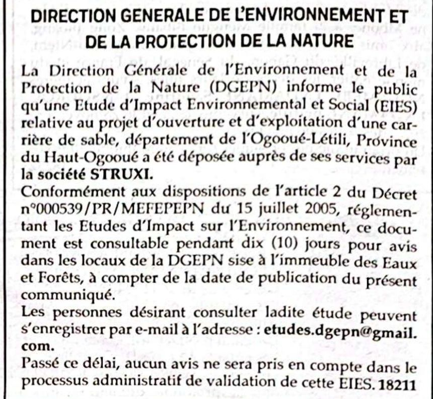 La Direction Générale de l’Environnement et de la Protection de la Nature (DGEPN) a annoncé le dépôt d’une Étude d’Impact Environnemental et Social (EIES) relative au projet d’ouverture et d’exploitation d’une carrière de sable dans le département de l’Ogooué-Létili, province du Haut-Ogooué, porté par la société STRUXI.