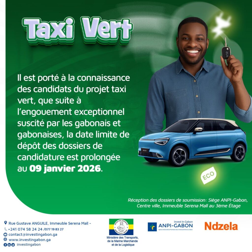Face à l’engouement exceptionnel des Gabonais, les autorités ont décidé de prolonger la date limite de dépôt des dossiers pour le projet Taxi Vert, initialement fixée plus tôt. La nouvelle échéance est désormais le 9 janvier 2026, afin de permettre au plus grand nombre de candidats de participer à cette initiative innovante.